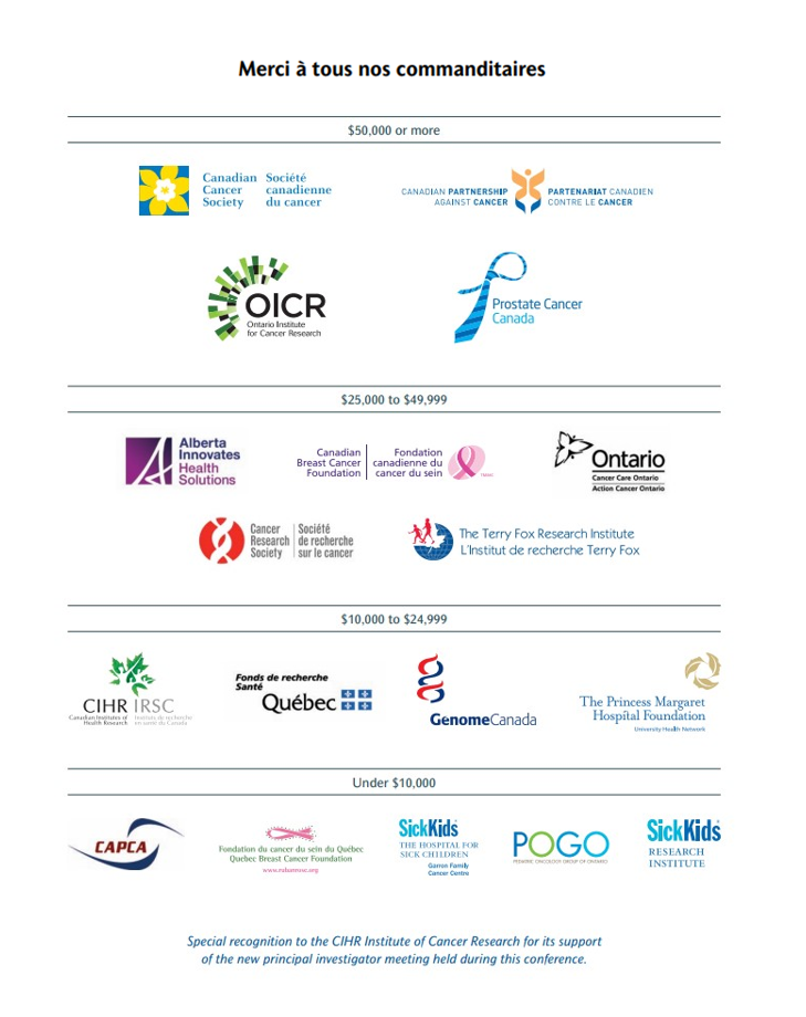 Au nom de l’Alliance canadienne pour la recherche sur le cancer (ACRC), nous tenons à remercier les membres du comité d’organisation, les présidents, les conférenciers, les présentateurs d’affiches, les membres de l’ACRC, les partenaires, les participants et le personnel pour leur contribution à la conférence inaugurale, qui fut une belle réussite.