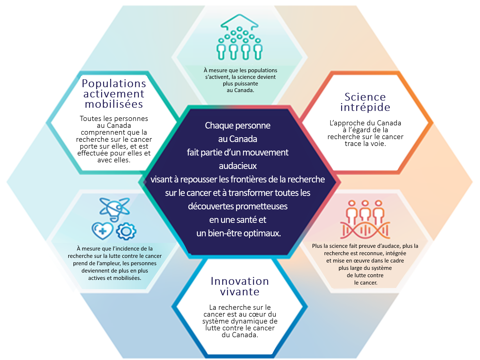 Nous demandons à toutes les personnes du Canada d’intégrer l’essence de cette Vision dans leurs propres plans stratégiques et dans leurs activités de promotion de la recherche ou de lutte contre le cancer, et de s’unir pour faire progresser un système de recherche, d’innovation et d’incidence sur le cancer qui soit actif, intrépide et vivant.