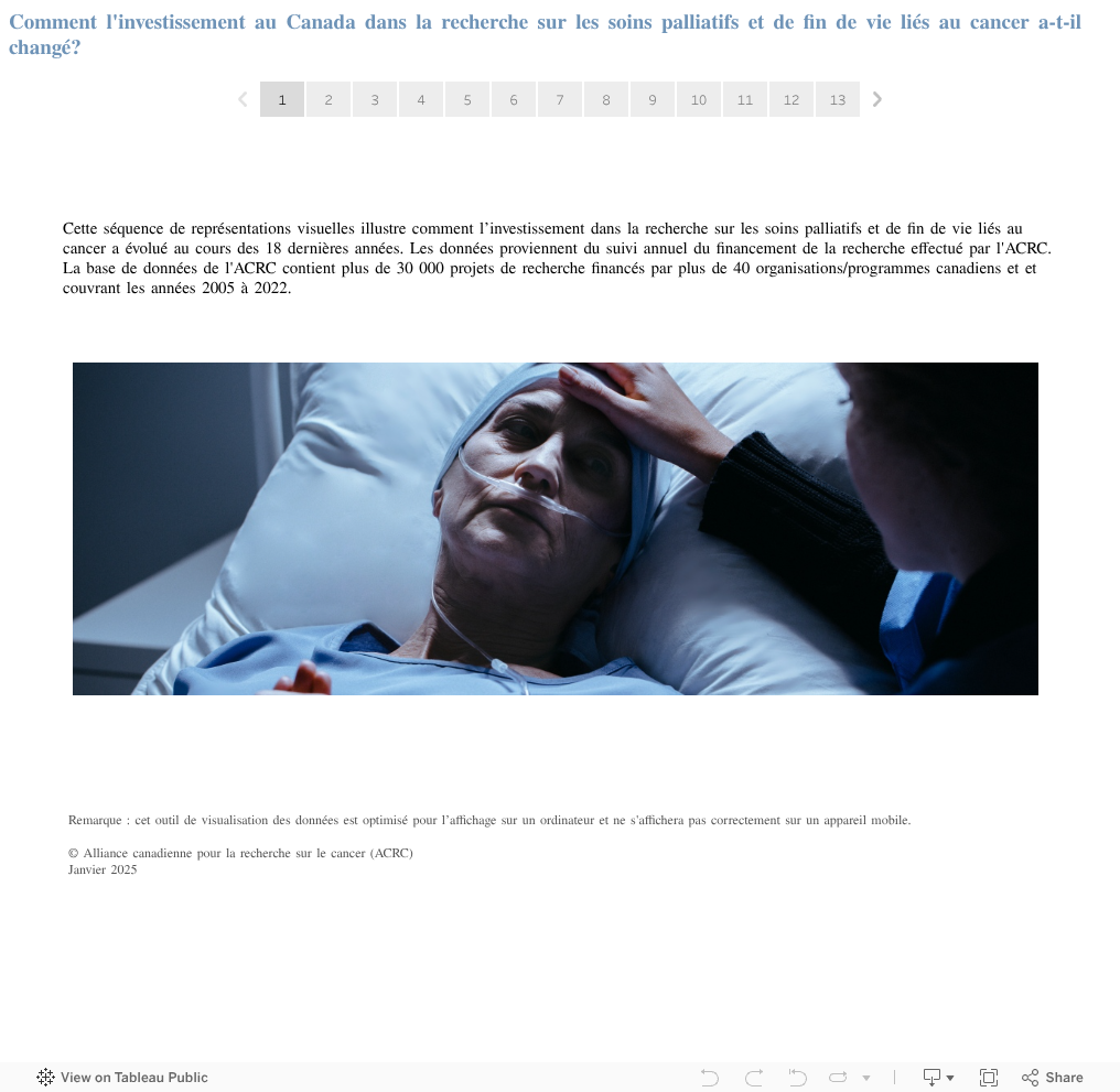 Utilisez cet outil de visualisation pour découvrir comment l’investissement dans la recherche sur les soins palliatifs et de fin de vie liés au cancer a évolué sur 18 ans, de 2005 à 2022.